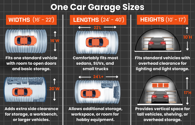 With proper sizing, a one-car garage can easily accommodate a vehicle along with extra storage or a small work area. Interior layouts are flexible since there are no interior support columns.